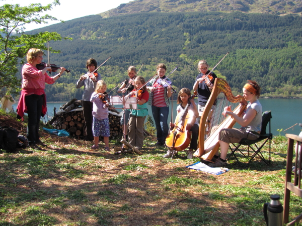 We celebrated a gloriously sunny May Day at Morlaggan with a musical performance by Helen Reid-Foster (fiddle) and her daughter, Pippa (clarsach), accompanied by local pupils of Helen’s playing their fiddles or cello. Anyone who’s visited Morlaggan will appreciate the dedication required to get a clarsach and a cello up the hill, but it was more than worth the effort. Helen had composed two pieces of music especially for the occasion.